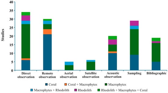 The analyzed studies covered three main types of marine habitats: macrophyte beds, rhodolith beds, and coral reefs. Various methodologies were employed, including direct, remote, acoustic, satellite and/or aerial observation, sampling, and bibliographic review.