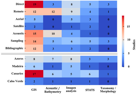 Comparative analysis among (Figure 5) and within (Figure 6) archipelagos revealed similar variations in the application of observation and data collection methodologies. In the Azores, remote observation was the predominant method, followed to a lesser extent by direct observation and sampling, with similar usage. Acoustic methods, aerial techniques, and bibliographic review were employed less frequently. In contrast, although all methodologies—except remote observation—were relatively more common in the Canary Islands, direct observation emerged as the primary method, complemented by sampling. The use of the remaining methodologies (remote observation, acoustic methods, and bibliographic review) was identical, whereas satellite observation was incorporated in a moderate and exclusive manner in the Canary Islands. In Madeira, direct observation, acoustic methods, and sampling constituted the most employed techniques, whereas remote sensing, aerial observation, and bibliographic review were applied to a lesser extent. The index of aerial observation usage was similar to that used in Canary Islands and the Azores. Finally, in Cabo Verde, the only methodologies implemented were remote observation—which proved to be the most used—followed by direct observation and acoustic methods, with equivalent usage. Bibliographic review was the only additional methodology recorded in all studies conducted in Cabo Verde.