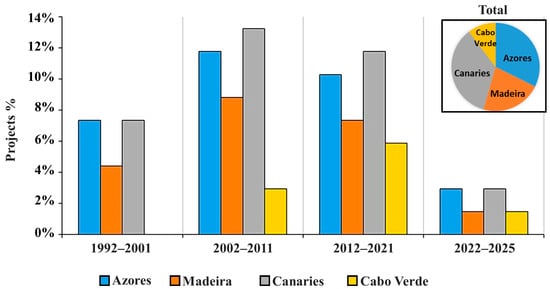 Percentage of European-funded projects by Archipelago. Sources accessed on 5 March 2025: https://cinea.ec.europa.eu/programmes/life_en; https://cordis.europa.eu/; https://interreg.eu/; https://fundacion-biodiversidad.es/; https://www.biodiversa.eu/; https://plocan.eu/; https://www.mac-interreg.org/.