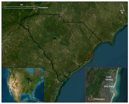 Goat Island and Oyster Landing study sites situated in South Carolina, USA (33.329715111576334, −79.20002737410039).