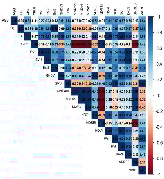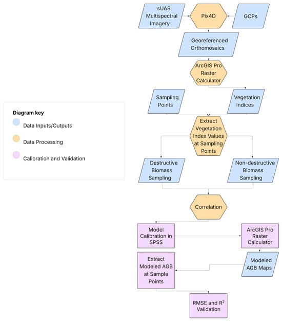 Vegetation indices (VIs) for this study were computed from the calibrated RedEdge-M bands of surface reflectance. Table 1 reveals the list of indices computed and explored for biomass estimation in this study. Each index was generated in ArcGIS Pro 3.2 using the equations listed in Table 1, appropriate image bands and the raster calculator tool. Both red, green, and blue- (RGB) based VIs and multispectral VIs were considered for each model. RGB-based VIs are being used more often in response to the availability of off-the-shelf sUAS without multispectral sensors capturing in the red edge or NIR wavelengths [41]. However, they have not yet shown to be as effective for biomass estimations as studies with destructive samples [42,43]. The zonal statistics as table tool was used with 1 m × 1 m square buffers to extract the VI value around each plot location.