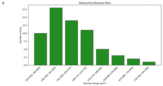 Bar plots of the recorded biomass values for destructive (A) and non-destructive (B) samples.