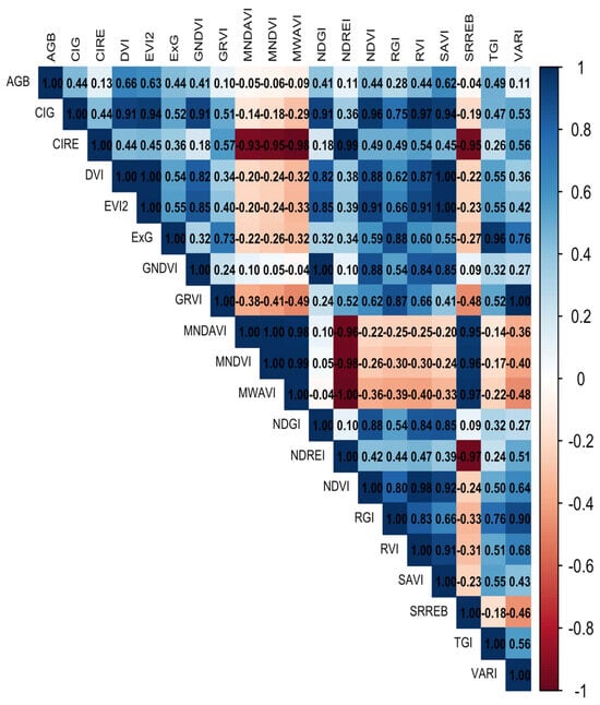 The non-destructive samples had far fewer indices with strong positive correlations, with only 4 showing any sort of use. The highest performing VIs were NIR-based indices, with RGB indices close behind in some regard, like the triangular greenness index (TGI; 0.49) (Figure 7). The highest performing NIR-based VIs were the Difference Vegetation Index (DVI; 0.66), Enhanced Vegetation Index 2 (EVI2; 0.63), and the soil adjusted vegetation index (SAVI; 0.62). These four were also fairly strongly correlated. Only one of the stronger positive correlation indices—SAVI—was used in other studies for biomass of S. alterniflora [50].