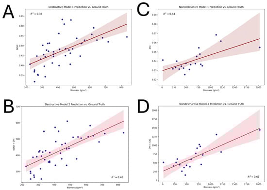 Validation for each of the models was performed using the remaining samples not used in training. The RMSE values for each of the four best performing models, one with a single variable and one with two for both destructive and non-destructive samples, are shown in Table 3. The lowest RMSE values (indicating a more effective model) came from the destructive sample-based models and reached as small as 70.91 g/m2. The non-destructive models were able to achieve an RMSE as low as 214.86 g/m2.