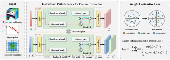 - Network Module: This module is built upon the Gated Dual-Path Network (GDPN), which facilitates contrastive learning by extracting spectral features. It incorporates a weighted contrastive loss framework to promote similarity learning, and the GDPN efficiently captures the spectral characteristics, enabling the differentiation of negative samples under the constraint of the WIN loss, thereby optimizing the overall learning performance.