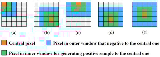 (a–e) The different methods of dual concentric windows for contrastive sample construction under different conditions, where the central pixel is located at different positions in the image.