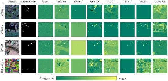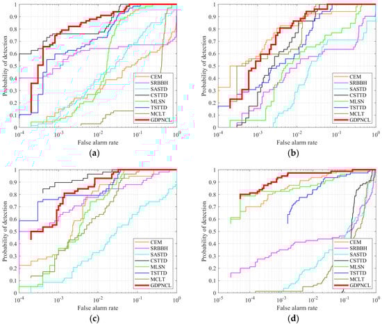As illustrated in Figure 3, the color maps of detection results for all detectors across the four HSIs reveal the performance of various detection methods. For the Urban-1 dataset, CEM, SASTD, TSTTD, and MSLN exhibit poor detection performance, capturing only a limited number of target pixels. The SRBBH detector fails to detect one of the target objects. In contrast, CSTTD and the proposed GDPNCL detector successfully detect targets at different locations. The Urban-2 dataset contains numerous small-sized targets. CEM and SRBBH introduce noise, while SASTD struggles to achieve satisfactory detection. Although CSTTD demonstrates strong performance with effective background suppression, it produces false alarms on the right side. The MCLT detector struggles to separate targets from the background, while TSTTD and MLSN yield incomplete detections. GDPNCL overcomes these challenges, delivering more accurate and reliable detection results. For the AVIRIS dataset, several deep learning-based methods (CSTTD, MCLT, TSTTD, MLSN) achieve decent detection but miss certain target pixels. SASTD generates excessively high detection values, complicating target identification. GDPNCL effectively detects all three planes, though its background suppression capability is slightly weaker than CSTTD, particularly in the lower-left corner of the image. For the RIT Campus dataset, the classic CEM detector performs well but introduces noise. The GDPNCL demonstrates significant advantages over competing methods, while SASTD, CSTTD, and MCLT fail to highlight targets. TSTTD also encounters the challenge of omitting some target pixels.