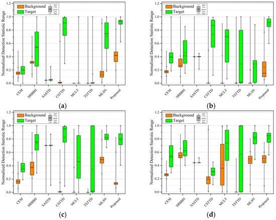 The TBS map assesses target-background separability through box plots, with the ordinate representing the normalized detection statistic [53,54,55]. Pixels are divided into either target or background based on their labels. The normalized detection statistics are then visualized as box plots, where greater separation between the target and background distributions indicates improved target discriminability while minimizing background interference.