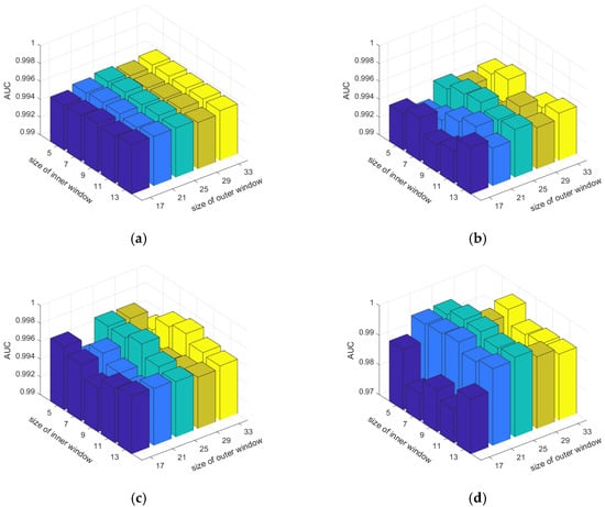 The detection performance comparison with different dual window sizes: (a) Urban-1, (b) Urban-2, (c) AVIRIS, and (d) RIT Campus.