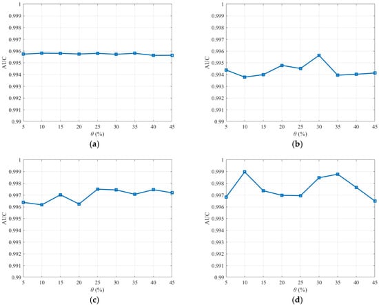 The AUC comparison with different implantation proportions: (a) Urban-1, (b) Urban-2, (c) AVIRIS, and (d) RIT Campus.