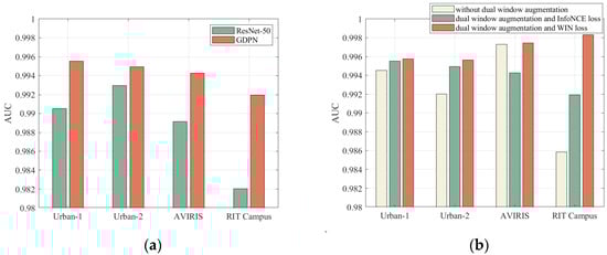The AUC results of the ablation experiments are shown in Figure 8. As illustrated in Figure 8a, the GDPN encoder significantly improves performance over the ResNet-50 baseline, with AUC increases exceeding 0.05 for the Urban-1, AVIRIS, and RIT Campus datasets. This demonstrates the effectiveness of the GDPN encoder in extracting local and global discriminative features.