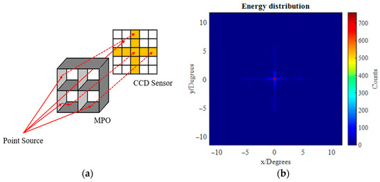 Lobster-eye imaging is a technique that leverages the unique optical structure of a lobster’s eye for X-ray observation, with its primary imaging component being a spherical micropore optic (MPO) [16]. This MPO comprises millions of cube-shaped micropores, all oriented toward a common center of curvature. X-ray photons reflect off these micropores’ ultra-smooth, metal-coated inner walls, maximizing the reflection efficiency and enabling effective X-ray focusing and imaging. When a point light source is focused through the MPO, a distinctive cross-shaped spot is produced on the CCD sensor located on the focal plane. Photons that underwent an even number of reflections within the MPO walls converged at the center of the cross, whereas those with one or three reflections appeared along the arms of the cross. Figure 1 presents a schematic of the lobster-eye point-source imaging principle and the point-source imaging results.