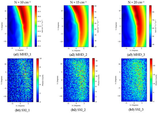 (a1–a3) Magnetosphere images from MHD simulation. (b1–b3) Simulated SXI photon count images.