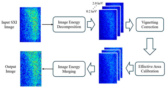 We developed an optimized model for processing lobster-eye X-ray images to address these issues. A flowchart of the algorithm is shown in Figure 6. The initial step in this model is calibration, targeting the correction of vignetting effects and effective area discrepancies. Vignetting correction removes edge darkening and achieves a more spatially uniform brightness distribution across the image. Effective area correction was applied by adjusting the photon response in different regions according to the response curve of the detector at various photon energy levels, thereby restoring the actual photon count in these areas.