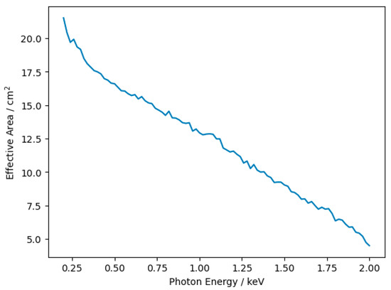 The effective area is a key technical indicator that describes the imager’s ability to collect photons. The larger the effective area, the higher the image quality and the greater the accuracy of the optical system observations. Correcting the effective area is crucial for ensuring the accuracy of photon counting. A reduction in the effective area decreases the number of detected photons, thereby affecting the precision of the observational results. Therefore, it is necessary to correct the effective area to ensure consistent detection efficiency under varying conditions. As the effective area varies significantly with different photon energies, the SXI images must be processed separately according to the photon energy. We obtained photon effective area data at different energies through simulations [23], as shown in Figure 9.