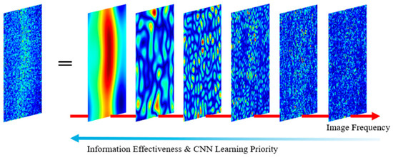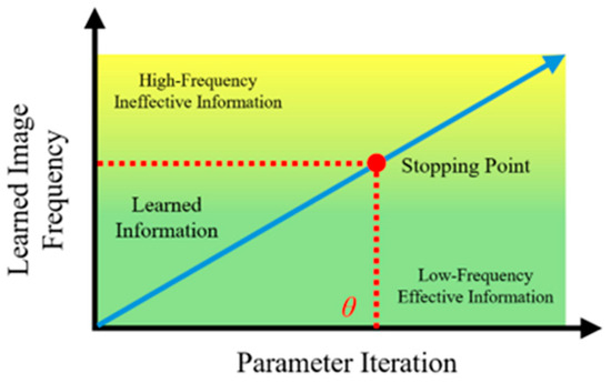 DIP demonstrates that during the iterative training process of finding parameters, the Convolutional Neural Network (CNN) has low impedance toward learning signals and high impedance toward learning noise. In other words, when fitting with a CNN, the network prioritizes learning the effective signals in the image. The higher the validity of the information, the higher the learning priority in the CNN. We understand this theory from the perspective of the image frequency domain, where the primary information of an image is located in the low-frequency domain, whereas the noise is located in the high-frequency domain [29]. Figure 11 shows the frequency-domain decomposition of the image. This effect can be explained by the CNN prioritizing the learning of low-frequency signals and the gradual learning of high-frequency signals as the number of iterations increases.