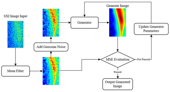 In this part of the algorithm, we input the calibrated SXI image and apply filtering to remove noise while preserving essential image features. Random noise is then added to the filtered image, which serves as the input to the generator to produce a new image. The generated image was evaluated against the filtered image using the mean square error (MSE). If the error does not meet the predetermined threshold, the generator parameters are updated through backpropagation, and the image is regenerated until the error evaluation passes. Once the evaluation is successful, the final generated image is output as the optimized SXI image. A flowchart of the DIP process is shown in Figure 13. It is important to emphasize that in the DIP, this processing optimization is performed independently for each SXI image. The network weights are initialized from scratch and trained on that image alone. Hence, the “training” phase and the “image-processing” phase are one and the same—the network converges while denoising the current frame, and the resulting output is taken as the restored image. No pretrained or shared model is reused across different images.