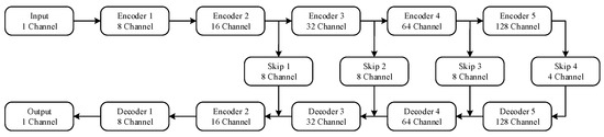 In this architecture, the encoder section is responsible for progressively downsampling the input data and extracting features through convolution operations while gradually reducing the spatial resolution of the feature maps. Each encoding layer consisted of two convolutional layers and a nonlinear activation layer, and the number of channels increased as the network depth increased. The encoder section contained five downsampling layers with channel numbers 8, 16, 32, 64, and 128. The decoder restores the features extracted by the encoder back to the input spatial resolution through upsampling. Each layer of the decoder corresponds symmetrically to a layer in the encoder, and skip connections are used to pass features from the encoding layers to the corresponding decoding layers. These skip connections effectively alleviate the vanishing gradient problem and prevent information loss in the deep networks. The decoder also consisted of five upsampling layers with the same number of channels as the encoder: 128, 64, 32, 16, and 8. Skip connections span four layers with 8, 8, 8, and 4 channel numbers.