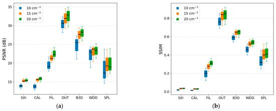 We calculated the MHD, original SXI, calibrated SXI, filtered SXI, and DIP-processed SXI images at each solar wind number density as well as the peak signal-to-noise ratio (PSNR) and structural similarity index (SSIM) indicators of the reference algorithm BM3D, wavelet denoising, and supervised learning. All images were normalized before calculation to ensure effective comparative analysis. We calculated 100 images for each stage and used box plots to represent the data distribution of each stage, as shown in Figure 17.