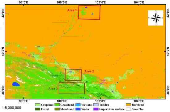 To obtain accurate downscaled LST, three experimental areas were chosen to discuss how to select the optimal variables for different land cover types. Figure 1 illustrates the geographical location of the experimental area. The base map is based on the 30 m resolution global land cover maps [61] released by Tsinghua University in 2017. Experimental areas 1 to 3 (hereafter termed A1, A2, and A3) are located near the downstream, midstream, and upstream of Heihe River Basin in Gansu Province, China. The main land cover types are bareland, cropland and bareland, and grassland and forest for A1, A2, and A3, respectively.