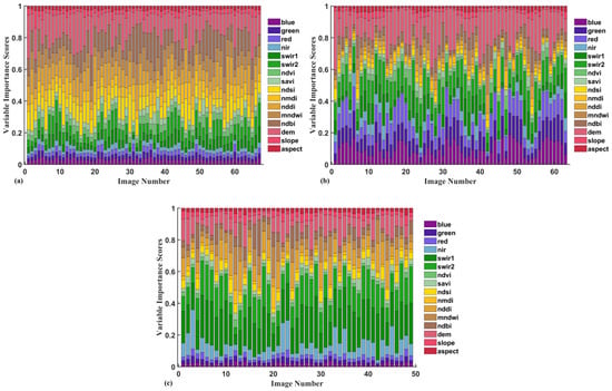 Figure 2. The independent variable importance scores across all research dates for RF model at experimental area 1 (a), experimental area 2 (b), and experimental area 3 (c).