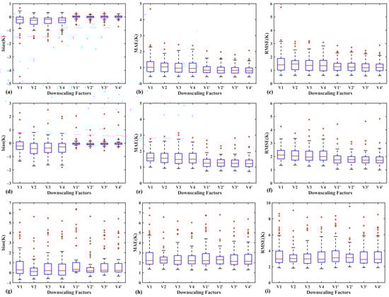 Figure 3. The evaluation results of downscaled LST using XGBoost and four categories of downscaling factors at three experimental areas. V1 uses land surface reflectance and terrain elements as downscaling factors. V2 uses multiple vegetation indices and terrain elements. V3 uses all variables as downscaling factors. V4 selects several variables as downscaling factors according to the importance of the variables in the machine learning algorithm. The downscaling factors with the slope and aspect factors removed are denoted as V1′, V2′, V3′, and V4′. Subfigures (ac) show the evaluation results for area 1, while (df) and (gi) show the results for areas 2 and 3, respectively. Red + represents the outliers.