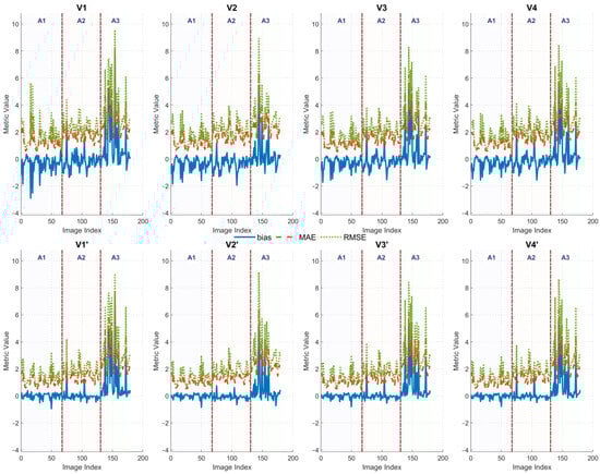 Figure 4. The evaluation results of downscaled LST using Random Forest and four categories of downscaling factors at three experimental areas. V1 uses land surface reflectance and terrain elements as downscaling factors. V2 uses multiple vegetation indices and terrain elements. V3 uses all variables as downscaling factors. V4 selects several variables as downscaling factors according to the importance of the variables in the machine learning algorithm. The downscaling factors with the slope and aspect factors removed are denoted as V1′, V2′, V3′, and V4′. A1, A2, and A3 show the evaluation results for area 1, area 2, and area 3, respectively. Solid, long, and short dotted lines represent bias, MAE, and RMSE.