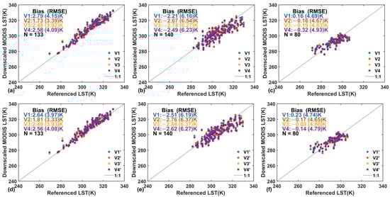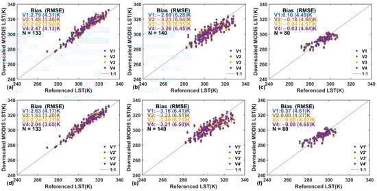Figure 6. The validation results of downscaled MODIS LST using Random Forest and four categories of downscaling factors at three experimental areas, i.e., 1 (a,d), 2 (b,e), and 3 (c,f). V1 uses land surface reflectance and terrain elements as downscaling factors. V2 uses multiple vegetation indices and terrain elements. V3 uses all variables as downscaling factors. V4 selects several variables as downscaling factors according to the importance of the variables in the machine learning algorithm. The downscaling factors with the slope and aspect factors removed are denoted as V1′, V2′, V3′, and V4′.