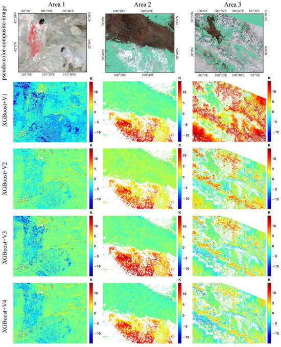 Figure 7. The pseudo-color composite image and the difference between downscaled LST using XGBoost and four categories of downscaling factors and the referenced LST at three experimental areas. V1 uses land surface reflectance and terrain elements as downscaling factors. V2 uses multiple vegetation indices and terrain elements. V3 uses all variables as downscaling factors. V4 selects several variables as downscaling factors according to the importance of the variables in the machine learning algorithm. In the pseudo-color composite image, cyan indicates invalid pixels and grey indicates snow pixels. The presence of white regions in color-filled plots signifies the presence of invalid pixels.