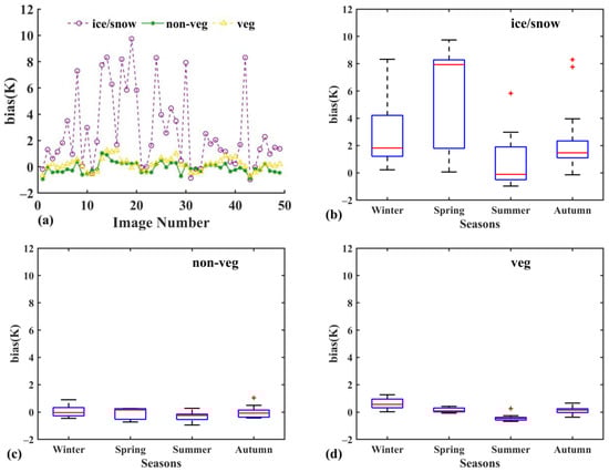 Figure 8. The evaluation results of downscaled LST at area 3 using XGBoost and land surface reflectance together with terrain elements as downscaling factors. (a) The time-series bias of land surfaces covered by ice/snow, non-vegetation (non-veg), and vegetation (veg); (bd) the seasonal bias of land surfaces covered by ice/snow, non-veg, and veg, respectively. Red + represents the outliers.