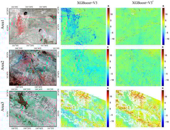 Figure 9. The pseudo-color composite image and the difference between downscaled LST using XGBoost with V3/V3′ as input and the referenced LST at three experimental areas. V3 uses all variables as downscaling factors. V3 with the slope and aspect factors removed is denoted as V3′. In the pseudo-color composite image, cyan indicates invalid pixels and grey indicates snow pixels. The presence of white regions in color-filled plots signifies the presence of invalid pixels.