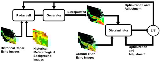 Through alternating training of the generator and discriminator, the discriminator continuously improves its ability to distinguish between real and generated data, while the generator progressively optimizes itself during the adversarial process, causing the generated radar echo data to approach the real echo distribution. Ultimately, this process leads the model to reach a Nash Equilibrium, where the discriminator can no longer effectively distinguish between real and generated data, ensuring that the extrapolated results maintain consistency with real radar echoes in terms of data distribution, thereby improving the accuracy of long-term sequence predictions.