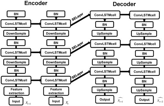 The encoder consists of three downsampling layers and three ConvLSTM cell layers. It transforms the input hidden states into a fixed-length vector encapsulating information from the input sequence. The hidden state from the final encoding step initializes the decoder’s hidden states. After each encoding step, the input to the ConvLSTM cells is downsampled via convolution to extract critical spatial features, enabling the ConvLSTM cells to better learn radar echo characteristics integrated with weather background information. Batch normalization is applied after each ConvLSTM cell layer to enhance model generalization. The Leaky-ReLU activation function is used to mitigate the vanishing gradient issue in the negative region.
