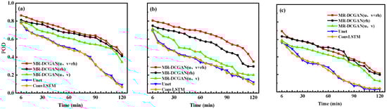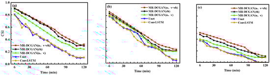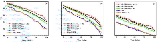 Under the conditions of 20, 30, and 35 dBZ reflectivity values, the variations in the CSI evaluation metrics for different models at 6 min intervals are shown in Figure 16. From the overall trend of the line graphs, the MR-DCGAN (u, v + rh) model continues to maintain a leading performance. Its performance in case three testing is, on average, 18.3%, 17.1%, and 19.8% higher than the models without physical variables (Unet, ConvLSTM), and 18.8%, 16.6%, and 21.1% higher, respectively.