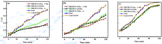 FAR variation curves at 6-min intervals for different extrapolation models on the test set with radar echo intensity thresholds of 20 dBZ (a), 30 dBZ (b), and 35 dBZ (c). The horizontal axis represents the 20 forecast time steps (120 min), and the vertical axis indicates the FAR values.