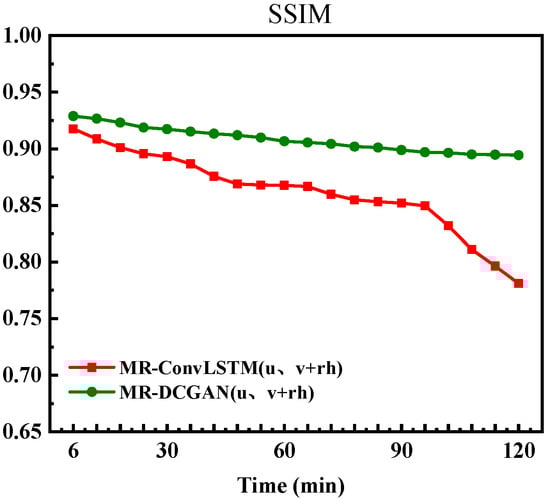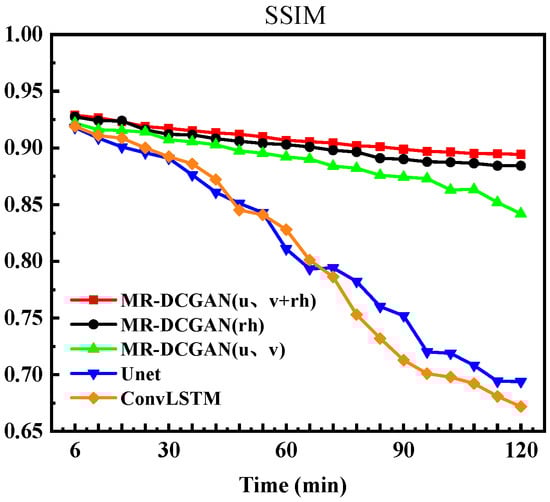 To further evaluate the visual quality of predicted images, this study introduced the SSIM metric for analysis. The variation curves of SSIM values over 20 time steps are presented in Figure 9. As shown in the figure, the SSIM values of all models gradually decline over time. Notably, the MR-DCGAN model proposed in this research exhibits a slower and more stable decay throughout the extrapolation process, with its superiority becoming particularly pronounced in the latter half of the prediction horizon. Among all configurations, the model integrating u/v and rh physical variables demonstrates the optimal performance.