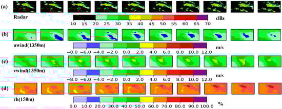 Previous 10 times input data for case 1 ((a). radar echoes, (b). u (1350 m), (c). v (1350 m), (d). rh (150 m)).