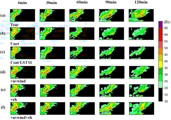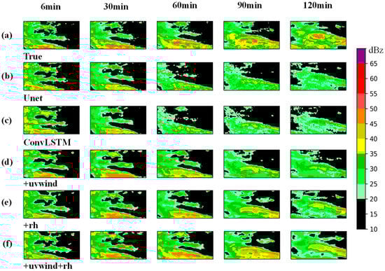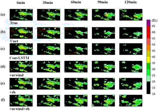 Radar echo extrapolation results at 6, 30, 60, 90, and 120 min for different models from 03:00 to 05:00 BJT on 12 August 2020: (a) observed radar echoes; (b) extrapolation using the Unet-based model; (c) extrapolation using the ConvLSTM-based model; (d) MR-DCGAN model incorporating u and v wind components; (e) MR-DCGAN model incorporating relative humidity (rh); (f) MR-DCGAN model incorporating both u/v wind components and relative humidity (rh).