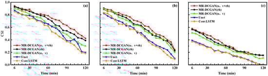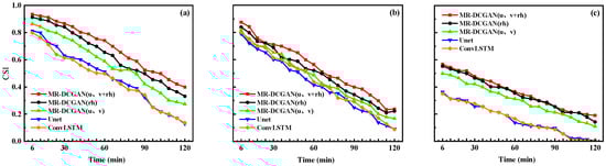 To further evaluate the extrapolation accuracy of each model for this specific case, the variations in the Critical Success Index (CSI) over 6 min intervals under reflectivity thresholds of 20, 30, and 35 dBZ were analyzed and compared, as shown in Figure 12. The MR-DCGAN (u, v + rh) model demonstrates average CSI improvements of 21.6%, 12.3%, and 21.1% over the Unet model and 23.2%, 10.4%, and 20.1% over the ConvLSTM model at the 20, 30, and 35 dBZ thresholds, respectively. Among all models, the MR-DCGAN (u, v + rh) model shows the slowest decline in CSI, indicating its superior ability to maintain echo structure characteristics during medium- to long-term extrapolation and delivering enhanced prediction accuracy.