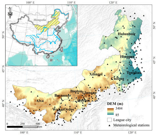 Inner Mongolia, covering an area of approximately 1.18 × 106 km2, is located in northern China (34°24′–53°23′N, 97°12′–126°04′E) and consists of 12 prefecture-level administrative divisions (leagues and cities) (Figure 1). The region is predominantly a plateau, with its average elevation exceeding 1000 m. It has a predominantly temperate continental monsoon climate, characterised by cold winters, hot summers, and large diurnal temperature variations. Meteorological records from 1990 to 2022 indicate that the annual average temperature ranges from 1.3 to 11.1 °C and decreases gradually from the southwest to the northeast. The annual precipitation ranges from 33.5 to 543.6 mm and increases from the southwest to the northeast. The annual average wind speed is approximately 2.7–3.1 m/s, with maximum wind speeds reaching up to 17 m/s. It has a variety of soil types, including aeolian sandy, dark brown, black, brown, chestnut grey-brown desert, and grey-brown desert soil. Most of these soils have a loose texture and are highly susceptible to wind erosion [41]. Over 70% of the region is covered by natural ecological areas such as grasslands, forests, and wetlands that serve as vital ecological barriers against the northwest wind and sand.