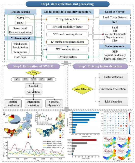 The present study developed an integrated wind erosion assessment framework based on multi-source data, incorporating remote sensing, meteorological, soil, and socioeconomic information to extract key driving factors. The RWEQ model was employed to simulate the SWEM from 1990 to 2022, capturing its spatial distribution, interannual variation, and seasonal dynamics. In combination with the GeoDetector model, dominant drivers and their underlying mechanisms were identified through factor detection, interaction detection, and risk detection. The overall workflow and analytical procedures are illustrated in Figure 2.