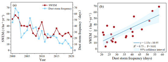 Aeolian processes at the land surface are the primary source of dust particles in the atmosphere and largely determine the frequency and intensity of dust storms [22]. Due to the absence of long-term field measurements, dust storm records from meteorological stations were used as proxy indicators to validate the SWEM simulated by the RWEQ model [21]. From 2000 to 2020, the SWEM simulated by the RWEQ model exhibited an overall decreasing trend, which closely mirrored the interannual variations in dust storm frequencies. Both variables exhibited peak values in 2001 (Figure 3a). Regression analysis further revealed a statistically significant positive correlation between the annual frequency of dust storms and the interannual variation in the RWEQ-estimated SWEM (R2 = 0.75, p < 0.01) (Figure 3b). These results indicate that the RWEQ model can effectively capture the actual dynamics of wind erosion in the study area and demonstrate a high degree of reliability.