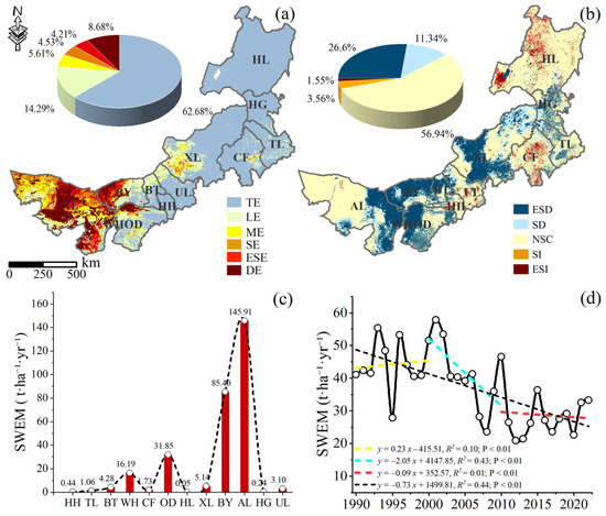 Spatial distribution and temporal variation of the SWEM in inner Mongolia from 1990 to 2022: (a) Average wind erosion intensity, note: TE, LE, ME, SE, ESE, and DE represent tolerable, light, moderate, severe, extremely severe, and destructive erosion, respectively; (b) Change trend, note: ESD, SD, NSC, SI, and ESI represent extremely significant decrease, significant decrease, no significant change, significant increase and extremely significant increase, respectively; (c) Total annual SWEM of each league/city; and (d) Annual variation.