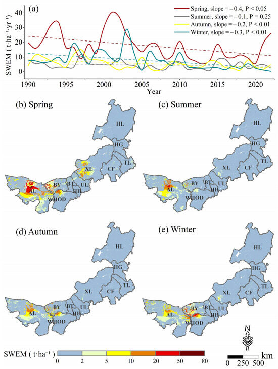 The spatial distribution pattern of seasonal wind erosion in Inner Mongolia generally mirrors that of the annual mean (Figure 5). However, the intensity of wind erosion varied markedly across seasons. Among the four seasons, wind erosion was most intense in spring (17.64 t·ha−1·yr−1), followed by winter (7.98 t·ha−1·yr−1), autumn (5.78 t·ha−1·yr−1), and summer (5.57 t·ha−1·yr−1), accounting for 49.48%, 22.38%, 16.21%, and 15.62% of the annual average SWEM (35.65 t·ha−1·yr−1), respectively. In terms of temporal trends (Figure 5a), SWEM exhibited a significant decreasing trend in spring (slope = −0.41, p < 0.05), autumn (slope = −0.17, p < 0.01), and winter (slope = −0.31, p < 0.01). In contrast, the trend in summer (slope = −0.05, p = 0.25) was not statistically significant.