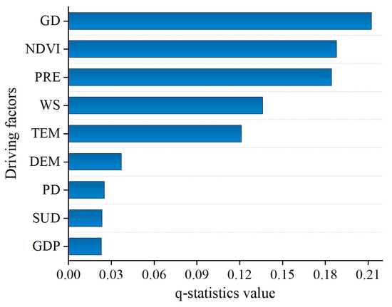 To quantify the influence of various driving factors on the SWEM in the study area, the factor detector module of the GeoDetector model was applied to calculate the interannual explanatory power (q-values) of nine potential drivers for SWEM from 1990 to 2022 (Figure 6). The results revealed significant differences in the mean annual q-values across variables and were ranked in descending order as follows: GD (0.21) > NDVI (0.19) > PRE (0.18) > WS (0.14) > TEM (0.12) > DEM (0.04) > PD (0.03) > SUD (0.024) > GDP (0.023). The statistical significance of q-values was confirmed (p < 0.001 for all factors), as detailed in Table 5.