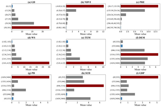 Based on the risk detector module of the GeoDetector model, the present study analysed the stratified intervals of each driver to identify the critical ranges that significantly affect SWEM (Figure 9). Among natural factors, wind-related indicators were found to be the primary drivers of SWEM. The results showed that SWEM values increased significantly with higher GD and WS levels, particularly when GD ranged from 58 to 101 days and WS from 3.01 to 4.23 m·s−1, during which the mean SWEM exceeded 30 t·ha−1 (Figure 9a,d). Regions with low NDVI values (<0.2) exhibited higher SWEM, suggesting that sparsely vegetated areas have weaker resistance to wind erosion and represent high-risk zones (Figure 9b). Precipitation and temperature were also important climatic factors that influenced wind erosion. When annual precipitation ranged from 30.17 to 135.59 mm and the mean annual temperature was between 3.01 and 4.23 °C, the corresponding SWEM values increased significantly, indicating that arid and warm climatic conditions elevate the risk of wind erosion (Figure 9c,e). In terms of topography, when elevation ranged within 1116 and 1355 m, the average SWEM reached a relatively high level, suggesting that mid-altitude areas may exhibit greater sensitivity to wind erosion (Figure 9f). In contrast, anthropogenic factors such as PD, SUD, and GDP had relatively weaker effects on wind erosion intensity. The intervals associated with increased wind erosion risk were concentrated within 1654–3404 for PD, 846–1116 for SUD, and 85–533 for GDP (Figure 9g–i).