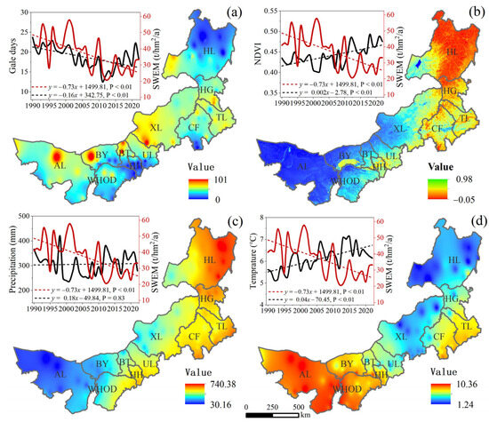 Spatiotemporal variations of key natural driving factors influencing SWEM in Inner Mongolia from 1990 to 2020: (a) gale days, (b) NDVI, (c) total annual precipitation, and (d) mean annual temperature.