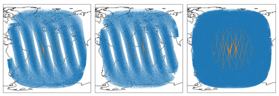 Example of nighttime collocations for one night. Blue indicates all available collocations, while orange shows selected collocations filtered by space, time, and angle. Left: MetOp-B IASI; Middle: MetOp-C IASI; Right: Combined MetOp-B and C IASI.