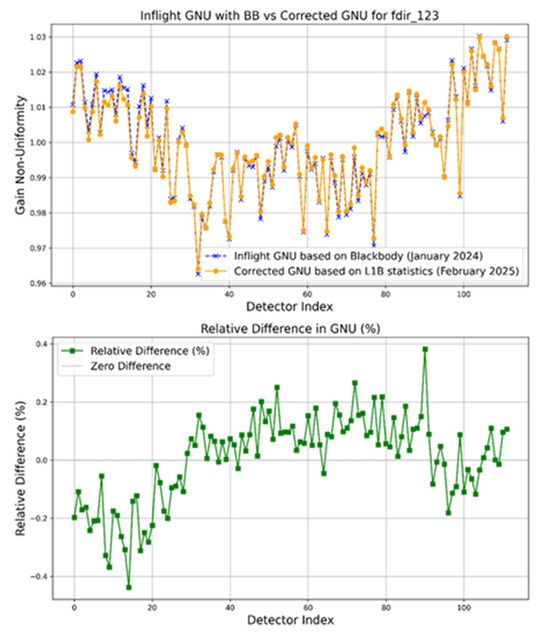 The per-channel gains are subsequently transformed into per-pixel gains through the application of GNU mappings, which compensate for non-uniformities in the response of the detection chain. Although the GNU is assumed to be stable over time, any change in the response could introduce striping artifacts. In order to cope with this equalization problem, channel dependent GNU templates are calculated using detector element specific gain data acquired over four consecutive days in January 2024, a period when the blackbody was operational. These datasets are used as first order correction of the GNU. Additionally, a new method is deployed for in-orbit estimation of gain equalization without the on-board calibration sources. The method is based on a modified approach of the relative spectral response function retrieval of hyperspectral instruments [33,34]. It derives the relative gain variation using a statistical approach employing Level-1b radiance data as input.
