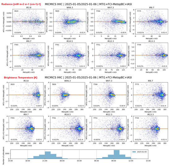 The external IR calibration system has been operational since 4 June 2024, enabling the production of synthetically calibrated L1C FCI data. Figure 6 presents scatter plots comparing FCI and IASI radiances (top) and brightness temperatures (Tb) (bottom) based on 24 h collocations used for daily gain retrieval. Each data point represents the difference in radiance or Tb between FCI and IASI, with the x-axis showing radiances or Tb from Metop-B and Metop-C IASI.